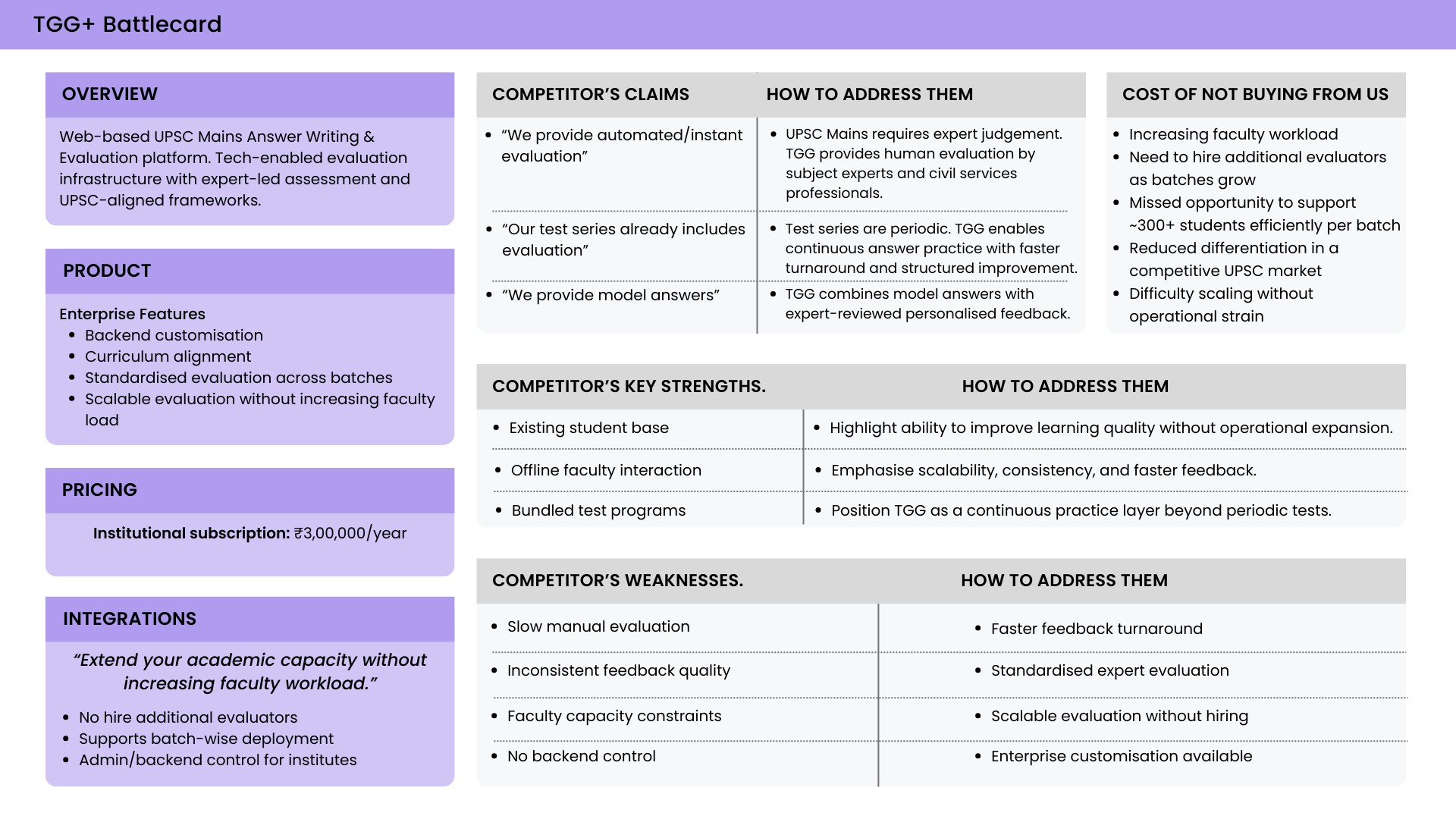 India's UPSC coaching institutes are operationally blind — they run on attendance registers and gut instinct. No tool purpose-built for back-end student performance analytics exists for the SMB coaching segment. TGG Craft fills this white space.