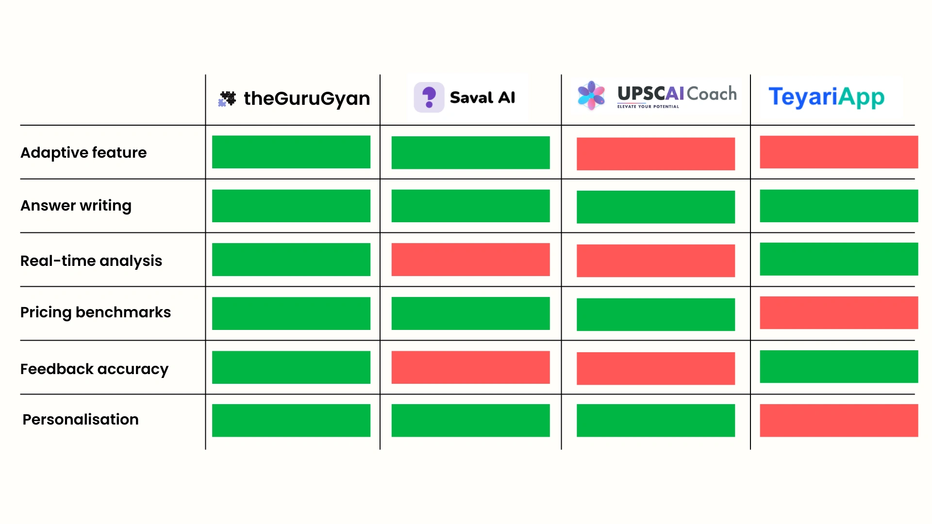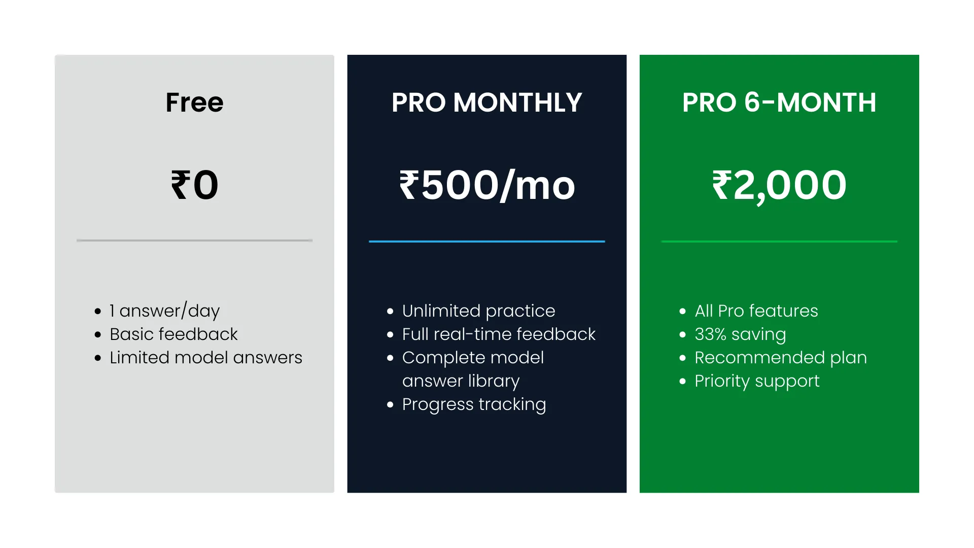 Every answer submitted builds a proprietary dataset of aspirant writing patterns, common errors, score-correlated structures, and subject-specific language. This data improves feedback quality over time. Unacademy has video views — not granular written answer data. Copying the product is easy. Copying the data is impossible.
