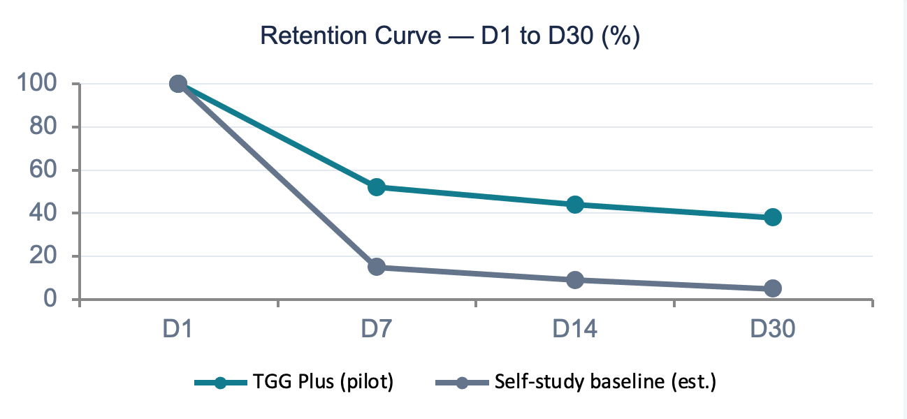 Each student's historical answers, feedback received, and improvement trajectory is stored in their TGG profile. After 60–90 days of usage, the profile becomes a personal writing coach. Moving to a competitor means starting from scratch. This is the Duolingo streak mechanism — but with career-level stakes.