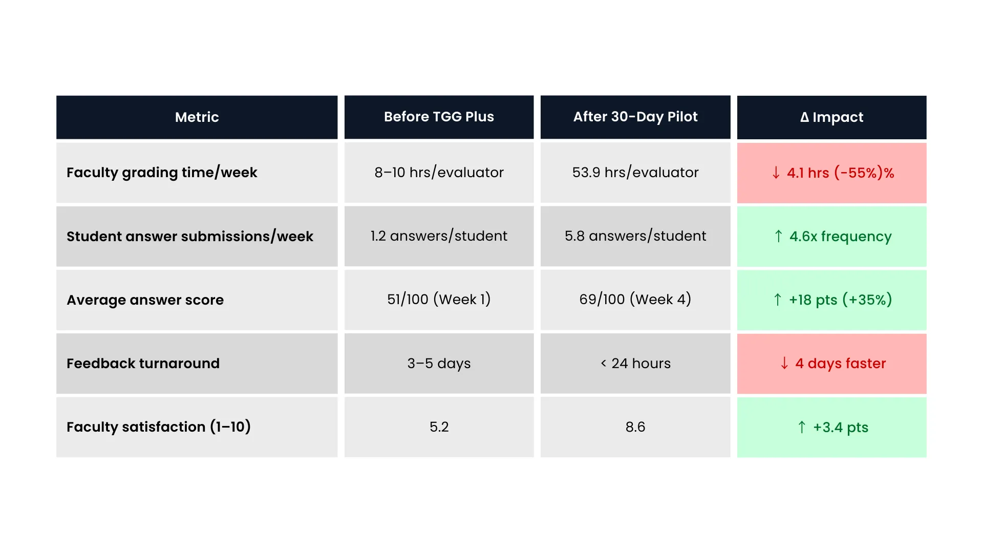 47-user pilot: 52% D7 retention, 6.2 submissions/user/week, 11% free→paid. Faculty: 4.1 hrs/week grading saved.