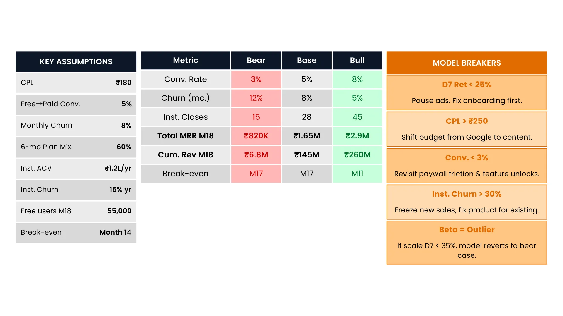 ₹18L in ads is solvable. If D7 < 25% at M2 end, pause spend. Fix onboarding first.